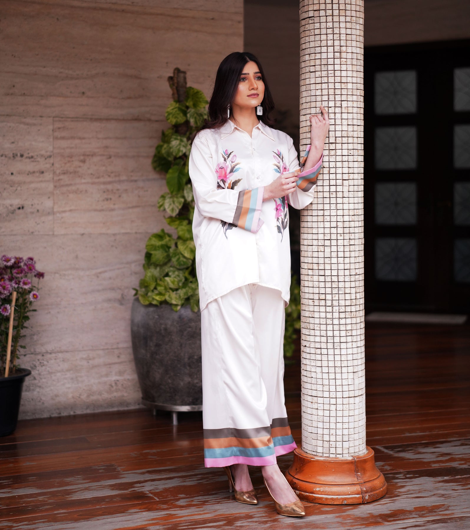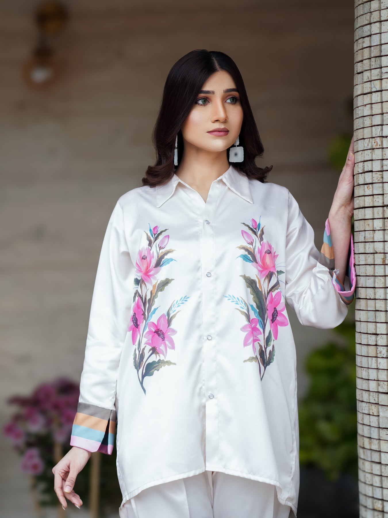 • x1 printed button up  shirt with one piece collar, printed floral motifs on front and straight full sleeves with solid lines border with a cut in four different colors.