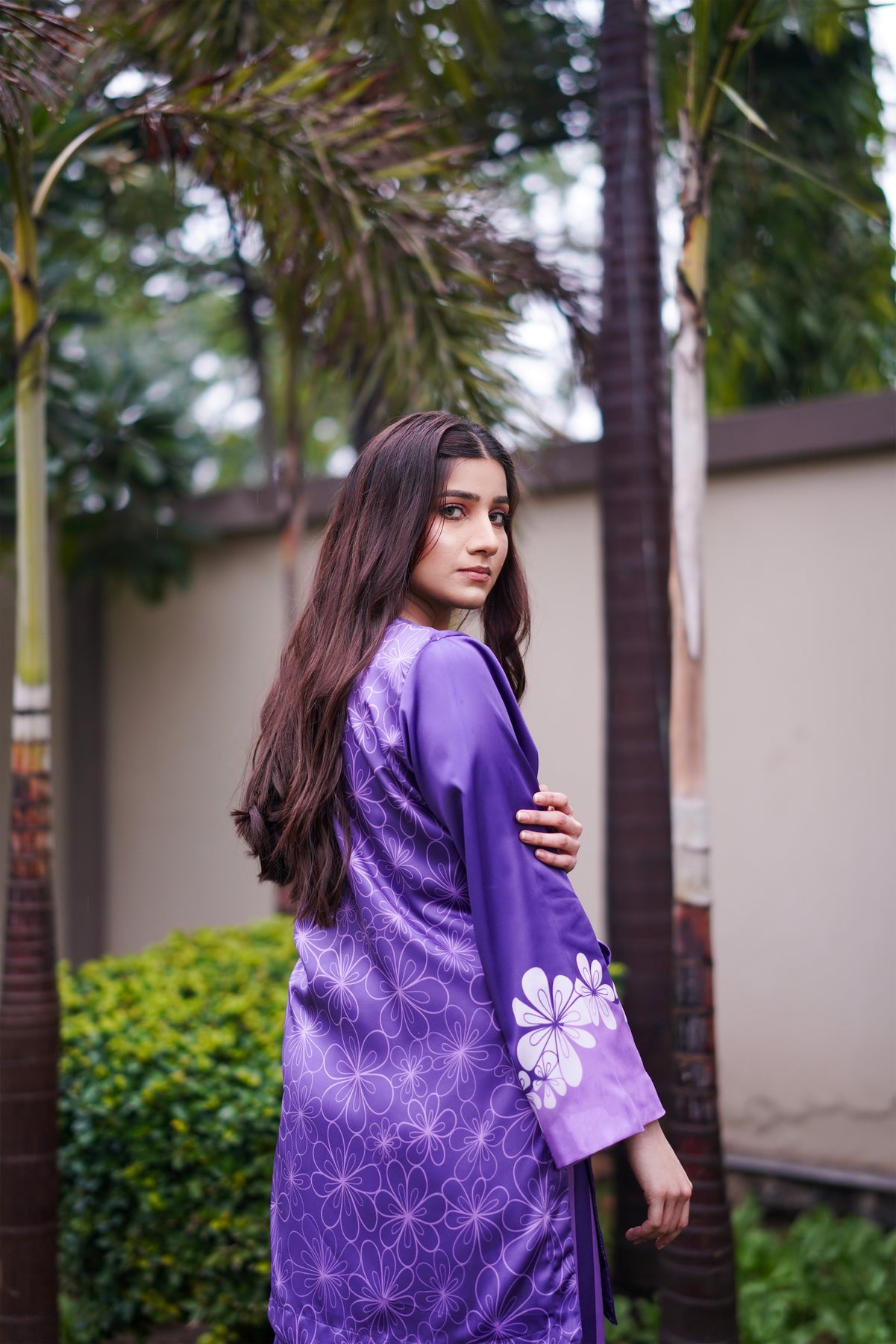 x1 straight cut shirt with solid front and printed back and flared sleeves in full length.